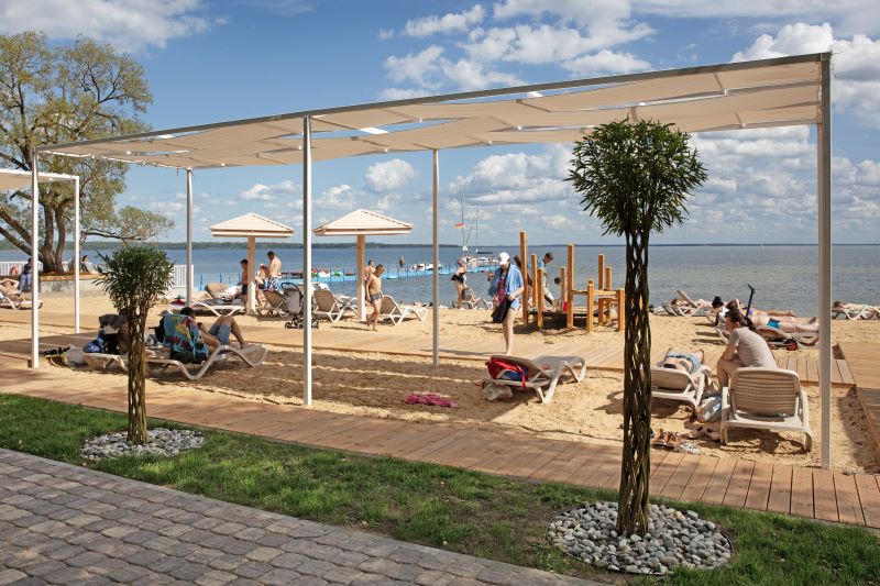 На берегу водоема есть собственный песчаный пляж. Он находится на расстоянии 400 метров от корпусов. На пляже есть лежаки и кабинки для переодевания.